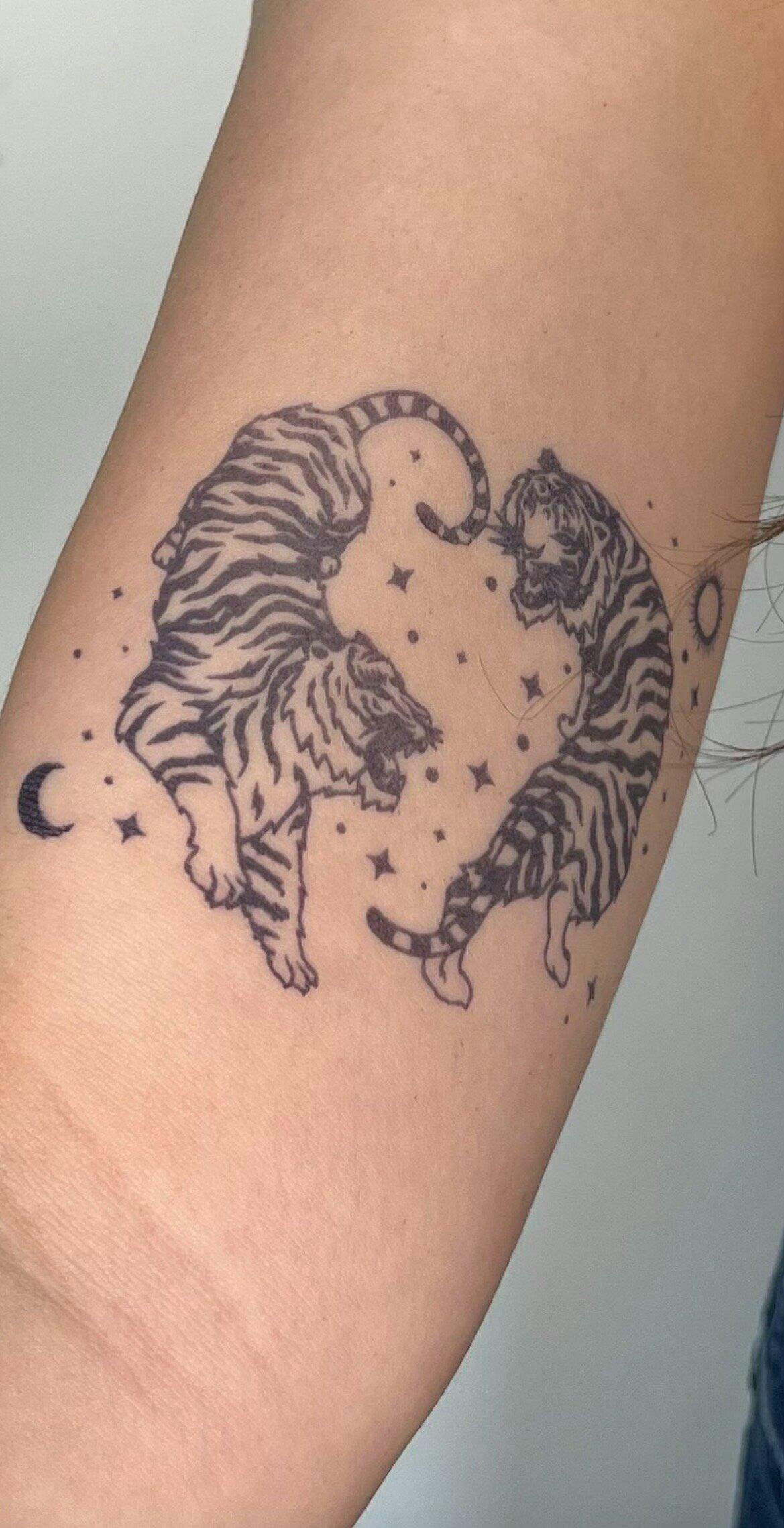 The tiger is a symbol of longevity, strength and courage, and is also reputed to have protective attributes. This tattoo represents two majestic tigers, face to face, forming the symbol of Yin and Yang. It represents the perfect balance between opposing forces: strength and gentleness, action and wisdom, masculine and feminine. Surrounded by a multitude of details, the two tigers are at the center of the cosmos, with representations of stars, sun and moon.